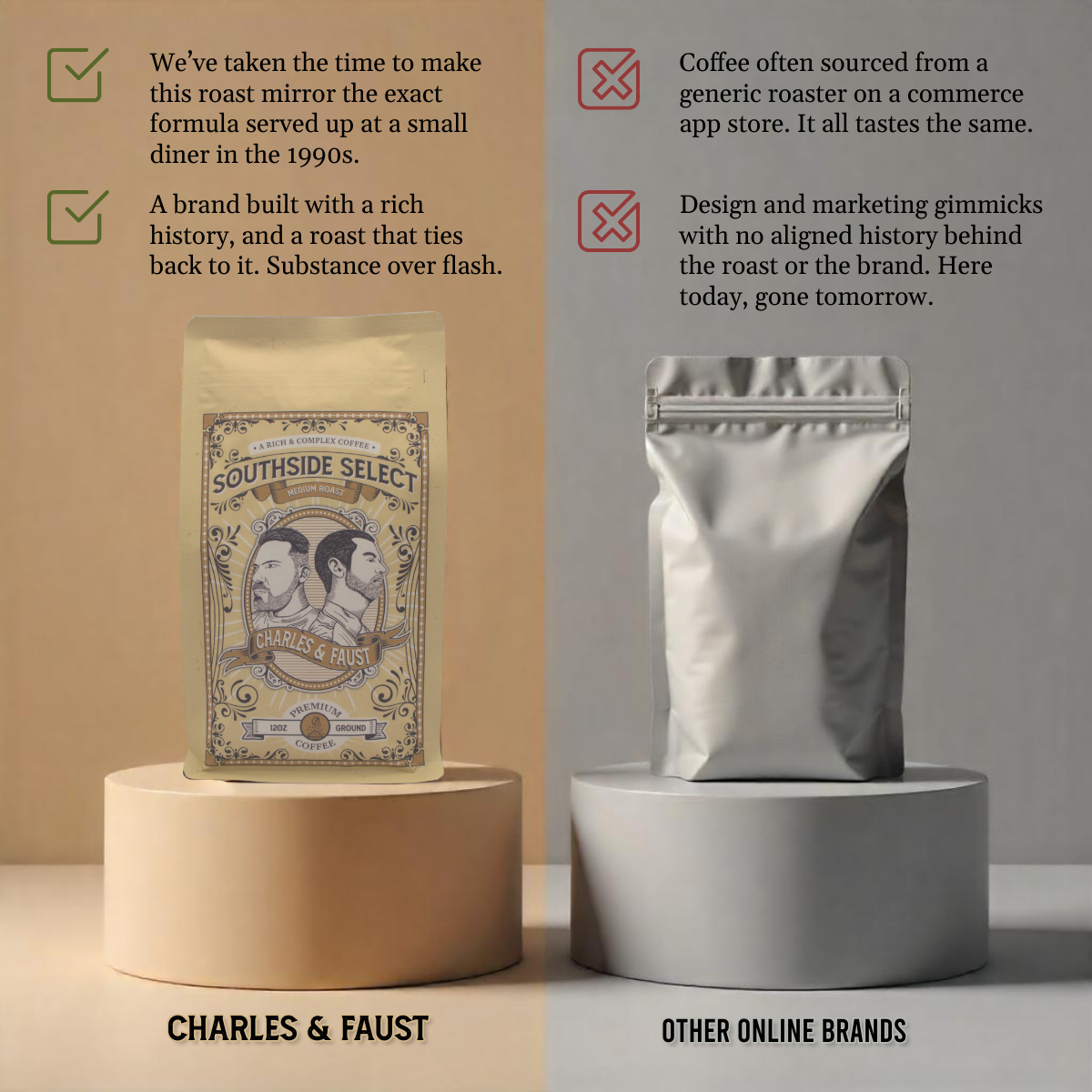 Authentic diner style coffee from the state known as the diner capital of the world, New Jersey. Modeled after the exact formula served up at a small diner by the shore in the 1990s. The Southside Select is a medium roast coffee with a rich and complex flavor profile sure to delight veterans of diner style coffee and newcomers alike. Taste the story, brew the legacy.